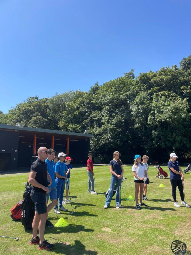 Sesiones prácticas en driving range y campo de golf con entrenadores profesionales.